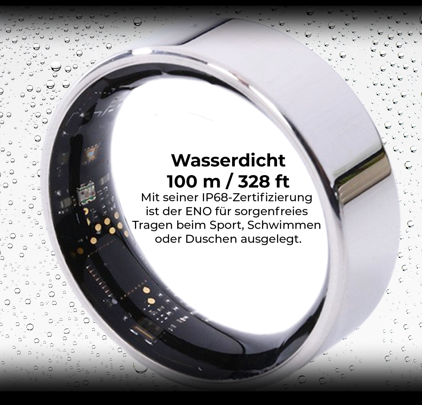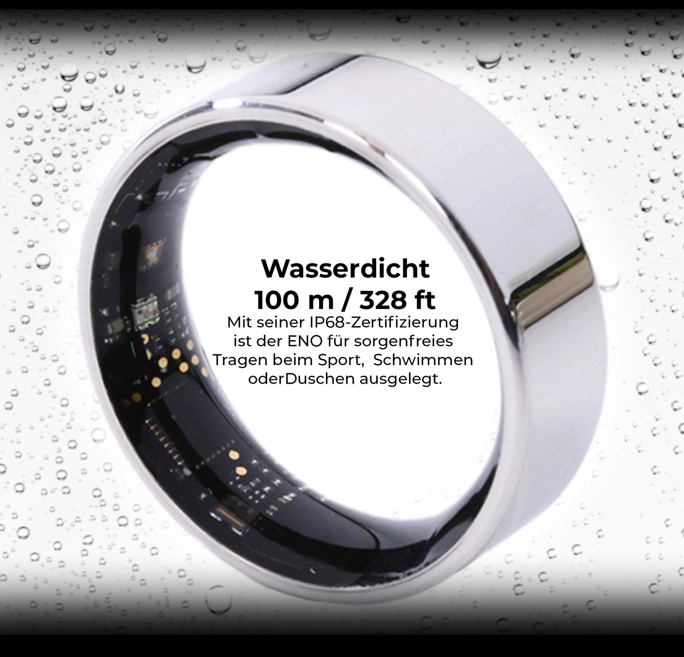 Der Ring ist wasserdicht bis zu 100 Meter / 328 Fuß und trägt die IP68-Zertifizierung. Duschen, Schwimmen oder Händewaschen – du kannst ihn jederzeit tragen, ohne dir Sorgen machen zu müssen.
