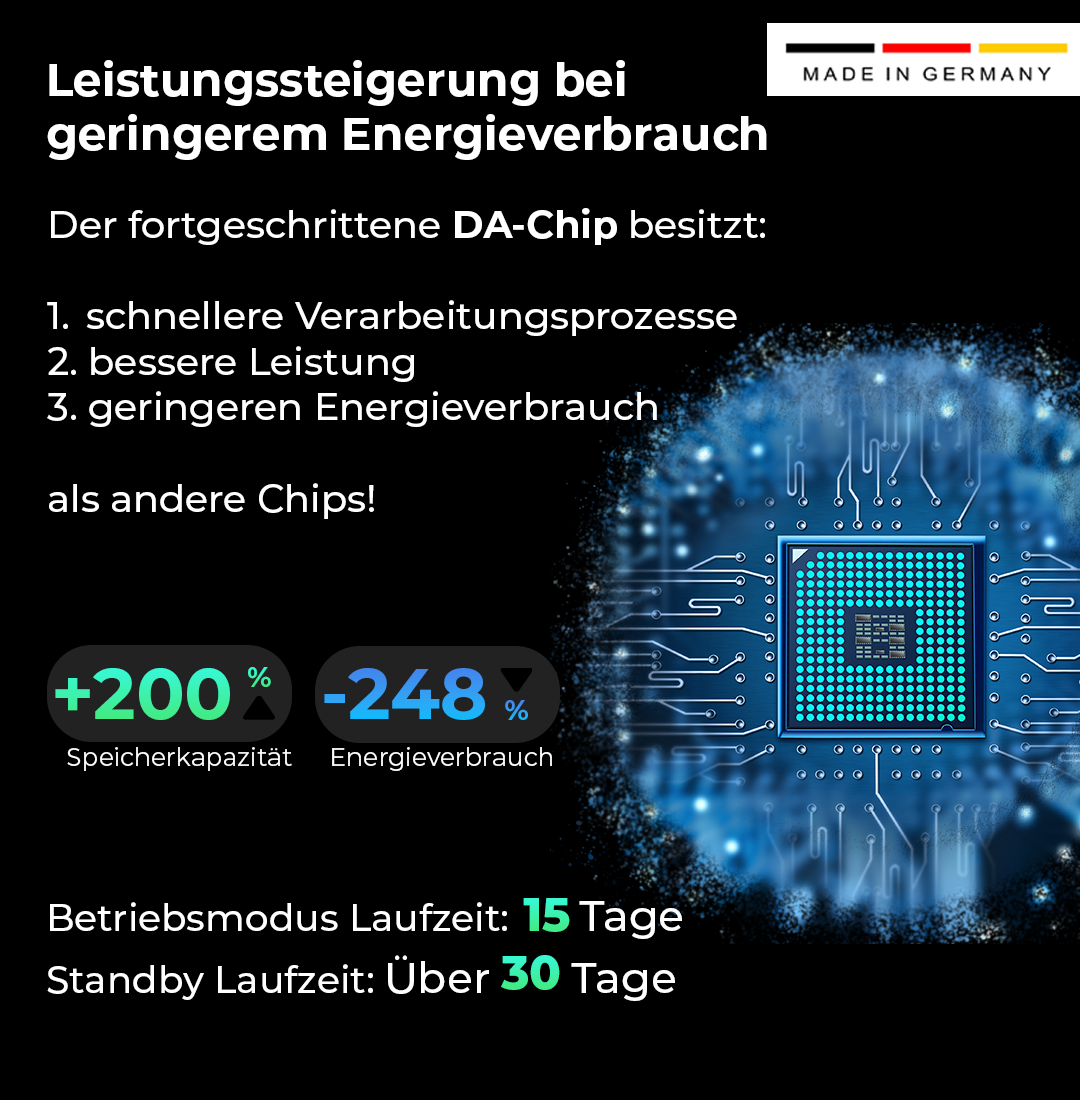 Im Inneren des Rings arbeitet ein leistungsstarker DA-Chip (Digital-Analog-Chip), der wichtige Körpersignale präzise erfasst und in digitale Daten umwandelt. So werden Schlaf, Bewegung und Vitalwerte in Echtzeit ausgewertet – für eine zuverlässige und smarte Analyse, direkt am Finger.